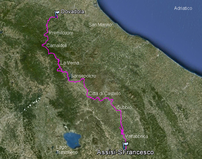 Si passa per il Santuario di Montepaolo, l'eremo e il convento di Camaldoli, il santuario della Verna, Sansepolcro e l'eremo di Montecasale, Gubbio e naturalmente Assisi.
