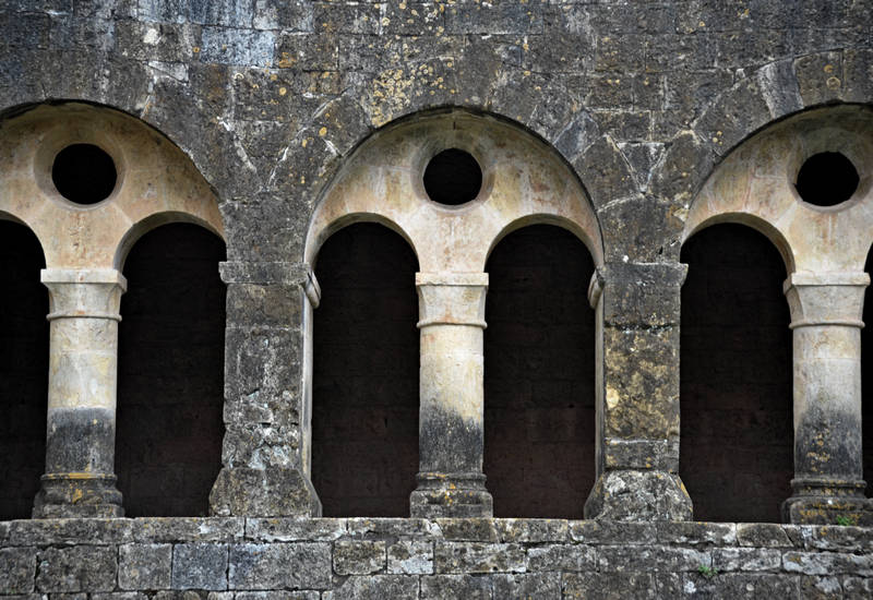 Lo spessore dei muri in cui si iscrivono le arcate geminate (doppie), l'oculo semplice che attraversa i timpani